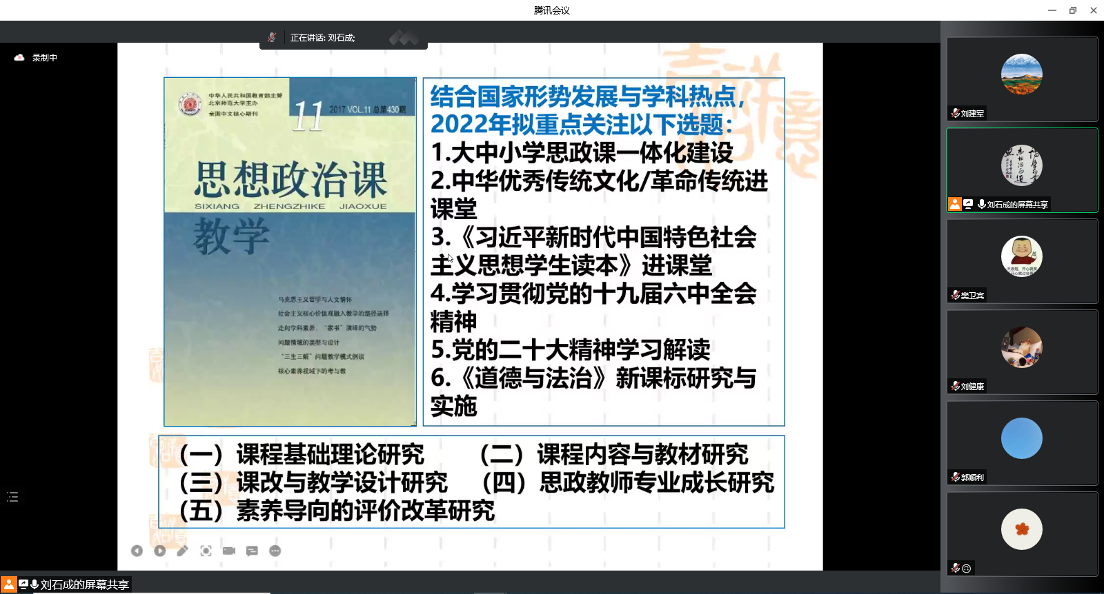 刘建军在总结发言中感谢刘石成副教授的精彩讲座,报告对本硕学位论文选题和写作具有很强的指导意义,是对学科教学(思政)教育硕士方向导师及研究生、本科生一次富有实效的高水平培训。要求学生在深入了解中学立德树人和思政课教学改革实践的基础上选好题,为论文写作开好头,迈稳第一步。