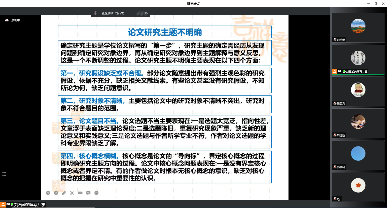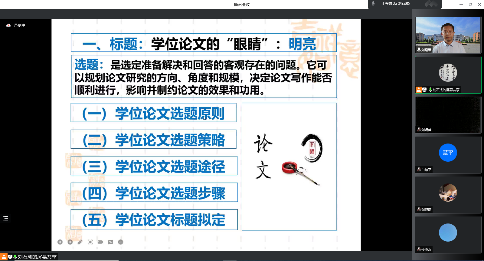 刘石成副教授基于八所师范大学学科教学(思政)教育硕士论文的文本分析,围绕教育硕士学位论文的选题原则、选题策略、选题途径、选题步骤和标题的拟定进行了全面细致的讲解。同时,结合自身学术研究经历和多年积累的论文指导经验,运用正反案例来详细地阐述论文选题时需要注意的各类事项,分享了许多关于学位论文选题的有效方法和技巧。