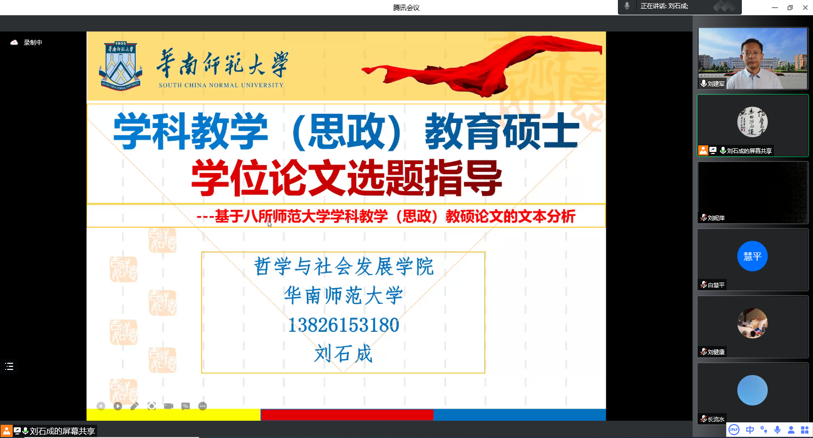 7月30日下午,华南师范大学哲学与社会发展学院学科教学(思政)学科负责人,教育部领航工程名师班政治学科导师、教育部中小学教师“国培计划”培训专家、广东省骨干教师培训专家、广东省高考命题专家库成员刘石成副教授应学院邀请作了题为《学科教学(思政)教育硕士学位论文选题指导》的专题讲座。讲座采用线上方式进行,由学院党总支书记刘建军主持,全体研究生导师、本科毕业论文指导教师、2021级学科教学(思政)教育硕士和2019级思想政治教育专业本科生共计140余人参加。