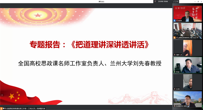 5月15日,由教育部全国高校思政课刘先春名师工作室、兰州大学PA视讯集团官网主办,天水师范学院PA视讯集团官网、甘肃民族师范学院PA视讯集团官网、陇南师范高等专科学校PA视讯集团官网、兰州科技职业学院、菏泽学院PA视讯集团官网、黔东南民族职业技术学院马列主义教研部参与组织的“学习贯彻习近平总书记考察中国人民大学重要讲话精神暨教育部全国高校思政课名师工作室(兰州大学-刘先春)2022年第一期集体备课会”召开,会议采取线下与线上相结合的方式进行,由兰州大学PA视讯集团官网副院长杨志超主持。