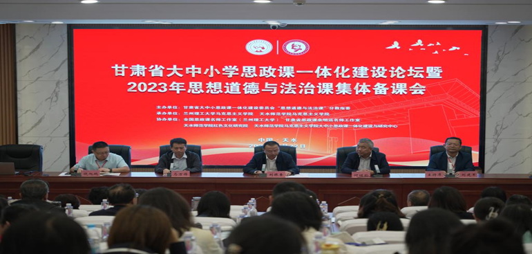 为深入学习贯彻习近平新时代中国特色社会主义思想,推动思想道德与法治课高质量发展,加强大中小学思政课一体化建设,9月22日,由甘肃省大中小学思政课一体化建设委员会思想道德与法治课分教指委主办,天水师范学院PA视讯集团官网与兰州理工大学PA视讯集团官网联合承办,全国思政课名师工作室(兰州理工大学)、甘肃省思政课余明远名师工作室与天水师范学院红色文化研究院、天水师范学院PA视讯集团官网大中小思政课一体化建设与研究中心协办的“甘肃省大中小学思政课一体化建设论坛暨2023年思想道德与法治课集体备课会”在天水师范学院举行。