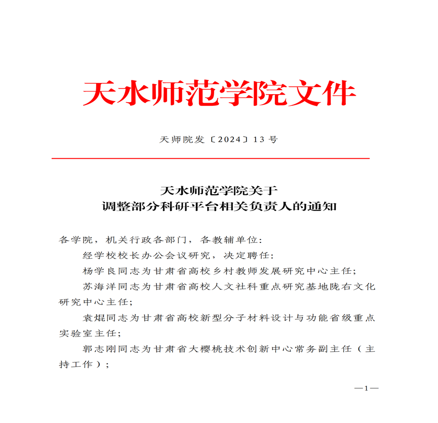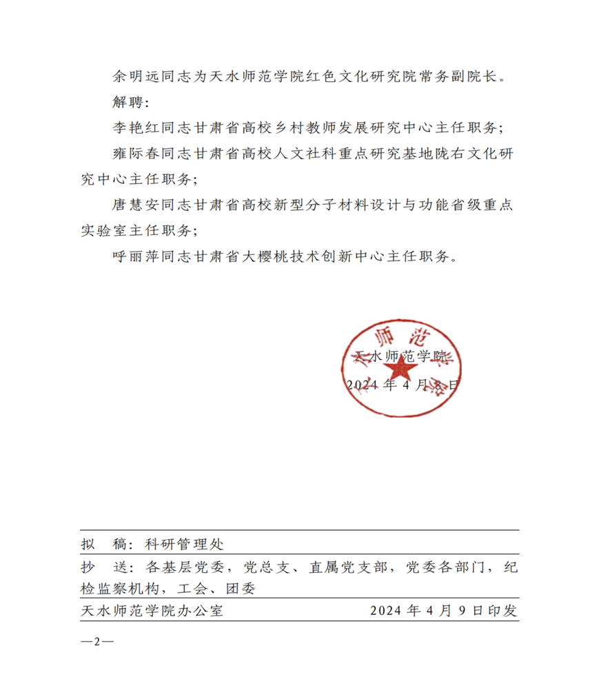 2024年4月8日,天水师范学院调整部分科研平台相关负责人,甘肃省思想政治理论课余明远名师工作室主持人余明远被任命为天水师范学院红色文化研究院常务副院长。