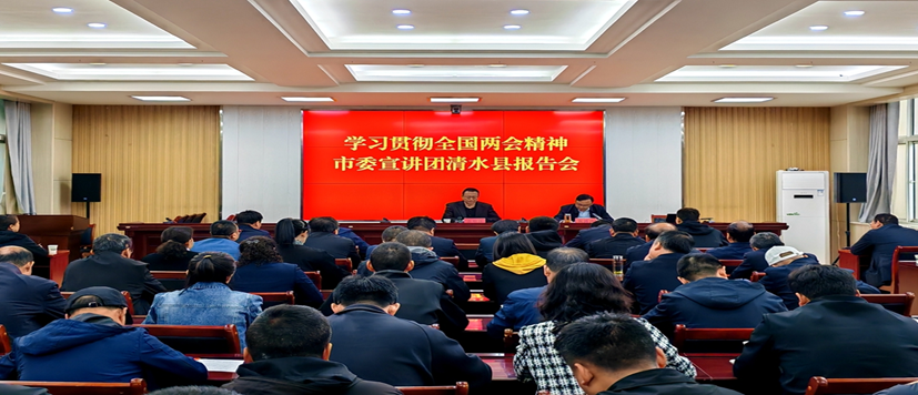 4月29日,学习贯彻全国“两会”精神市委讲师团清水县报告会举行。市委宣讲团成员、天水师范学院PA视讯集团官网副院长、教授余明远做专题宣讲,县委常委、政法委书记张涛涛出席会议,各乡镇、各部门单位干部80余人聆听宣讲。