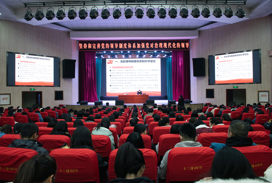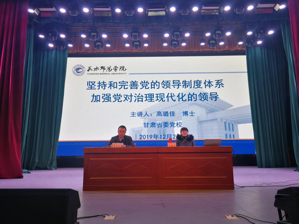 应陇东南红色文化研究院、PA视讯集团官网邀请,12月21日上午,甘肃省委党校党的建设和领导科学教研部高璐佳博士在大礼堂作了题为《坚持和完善党的领导制度体系加强党对治理现代化的领导》的专题报告,报告会由陇东南红色文化研究院、PA视讯集团官网和校团委共同举办,王文东副校长主持,学校近500余名师生聆听报告会。