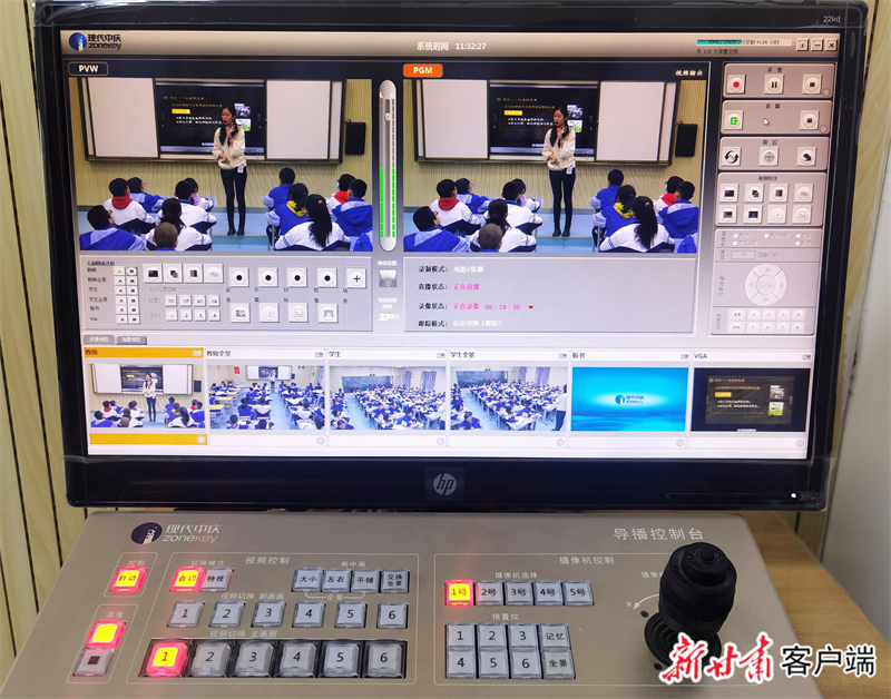一面玻璃相隔,几名教师坐在这间录播教室后部的观摩室观课;录播系统实时录制课堂教学情况,向未到场的其他教师线上直播,实现了随时随地看课评课,以及跨时空精准教研。