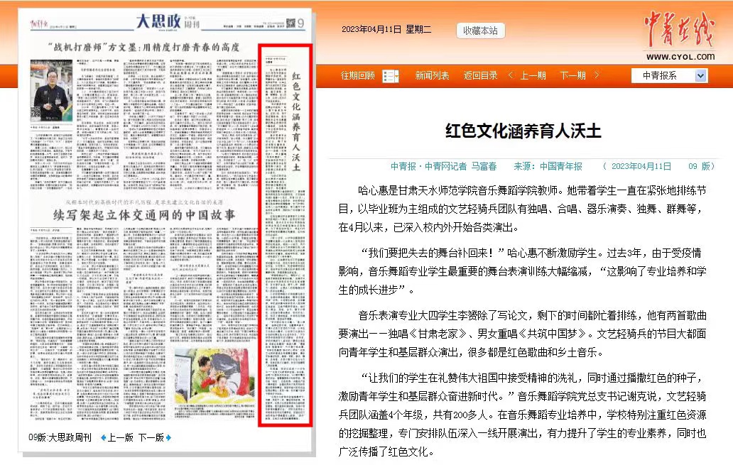 “让我们的学生在礼赞伟大祖国中接受精神的洗礼,同时通过播撒红色的种子,激励青年学生和基层群众奋进新时代。”音乐舞蹈学院党总支书记谢克说,文艺轻骑兵团队涵盖4个年级,共有200多人。在音乐舞蹈专业培养中,学校特别注重红色资源的挖掘整理,专门安排队伍深入一线开展演出,有力提升了学生的专业素养,同时也广泛传播了红色文化。