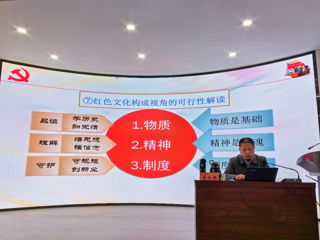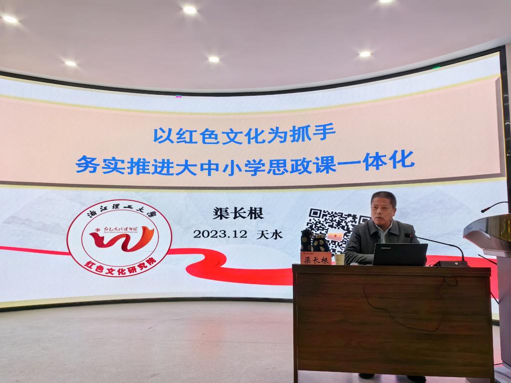 为贯彻落实习近平总书记在学校思想政治理论课教师座谈会上的重要讲话精神,深入学习习近平文化思想,进一步发挥学院作为教育部大中小学思政课一体化共同体(甘肃)建设成员单位、甘肃省教育系统红色文化育人共同体牵头单位作用,提升红色文化助推大中小思政课一体化建设实效。12月11日,学院邀请教育部高校思政课教指委《毛泽东思想和中国特色社会主义理论体系概论》分教指委委员、中国红色文化研究会常务理事、浙江省马克思主义理论专业教指委副主任委员、浙江理工大学红色文化研究院院长渠长根教授来校作了题为“以红色文化为抓手 务实推进大中小思政课一体化”的专题讲座,此次讲座纳入天水师范学院红色文化研究院“红色讲堂”第四讲。讲座由学院党委书记刘建军主持,学院教师、研究生和本科生共100余人聆听讲座。